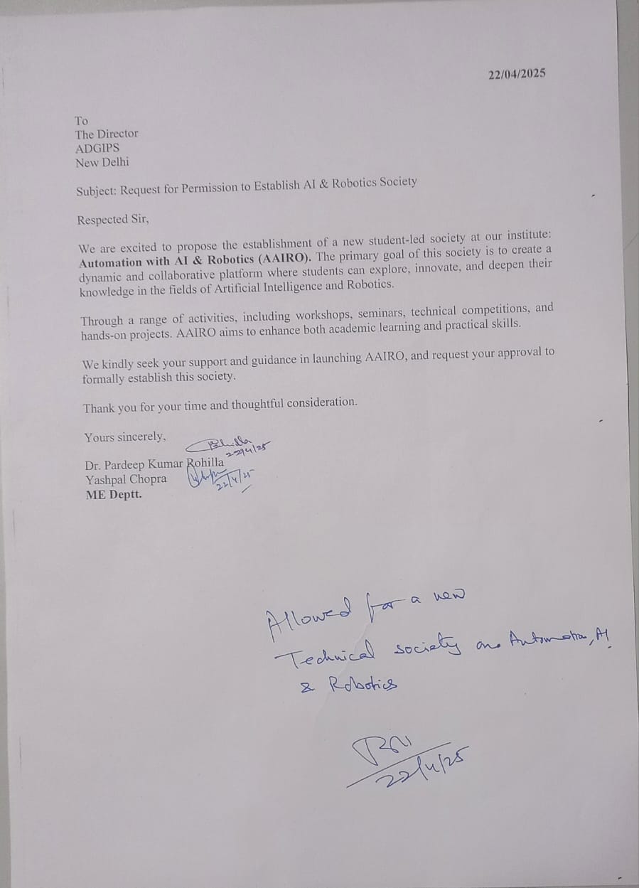 AAIRO is a recognized student society under ADGIPS with approvals from the institution’s faculty council and academic committee.